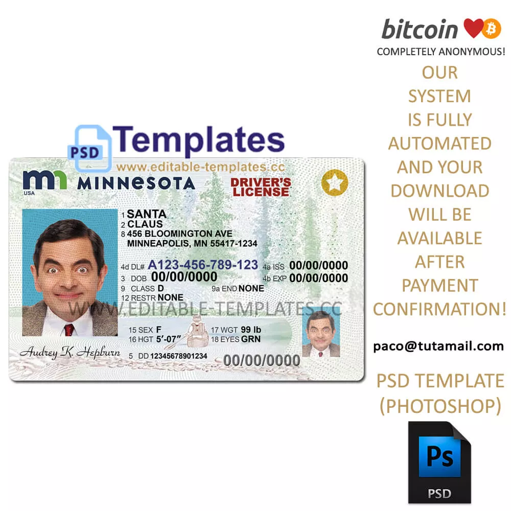 This Minnesota MN driving license template is a High quality template (300 dpi). You can change the photo, number, name, address, birth date, expiry date, etc. (Fully editable, all fonts included)