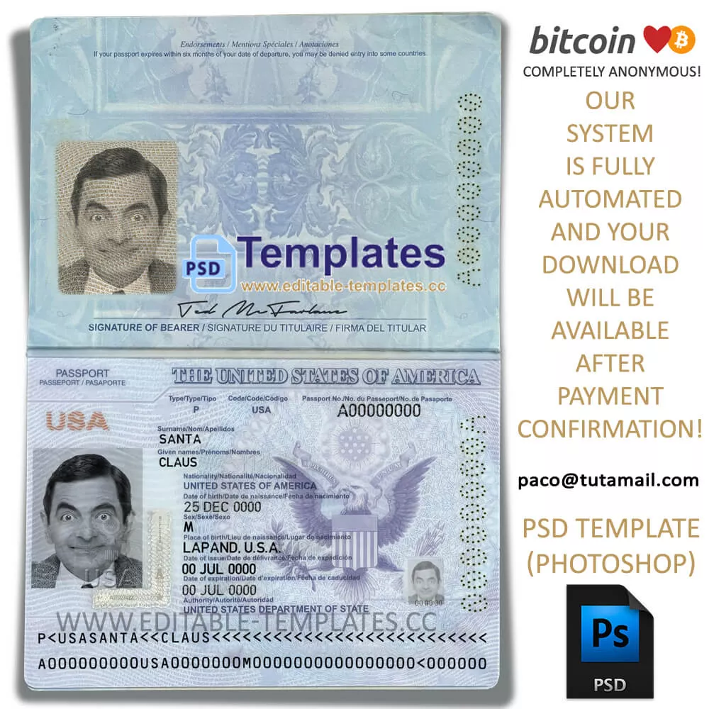 This pre-designed Latest Version US passport template allow you to input your information and photo quickly and easily, saving you time and effort.